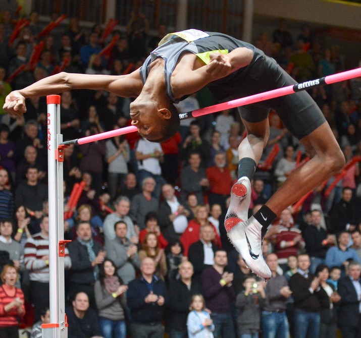 Foto č.1 Nad latkou Mutaz Essa Barshim držiteľ rekordu BBL výkonom 240 cm z roku 2015
